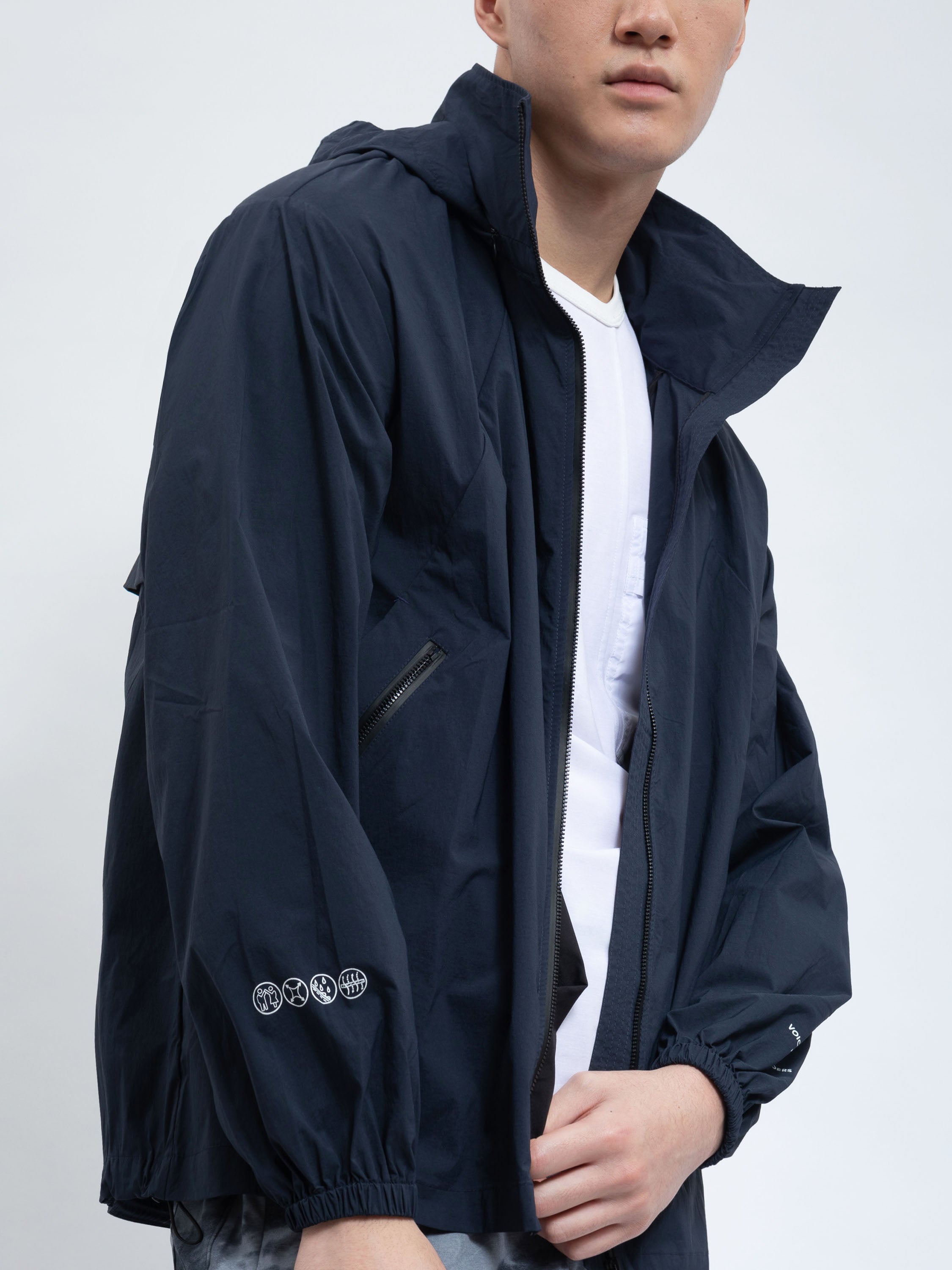 • Packable hoodie storage into collar via invisible zipper.