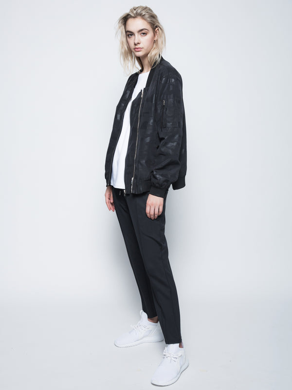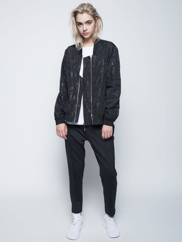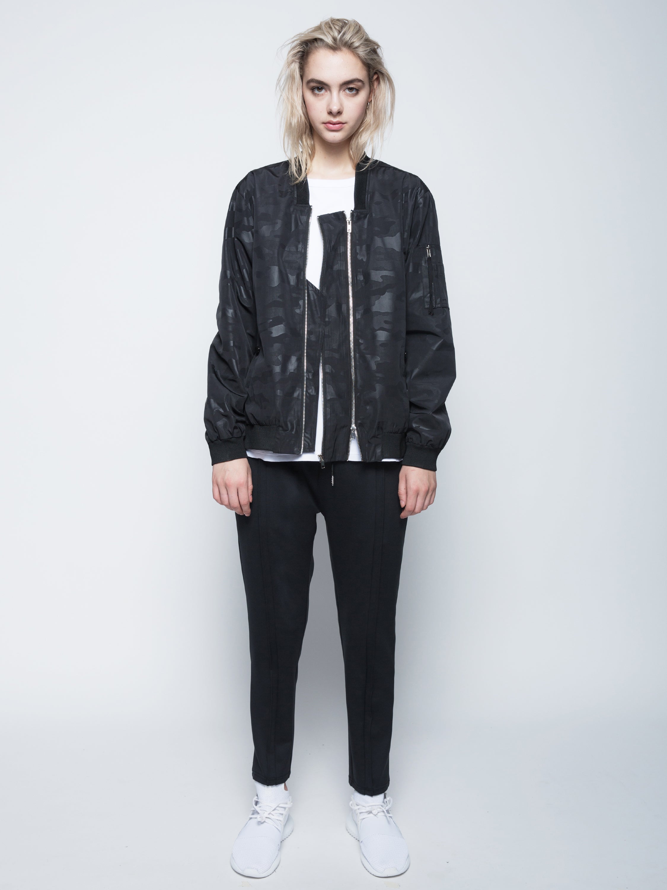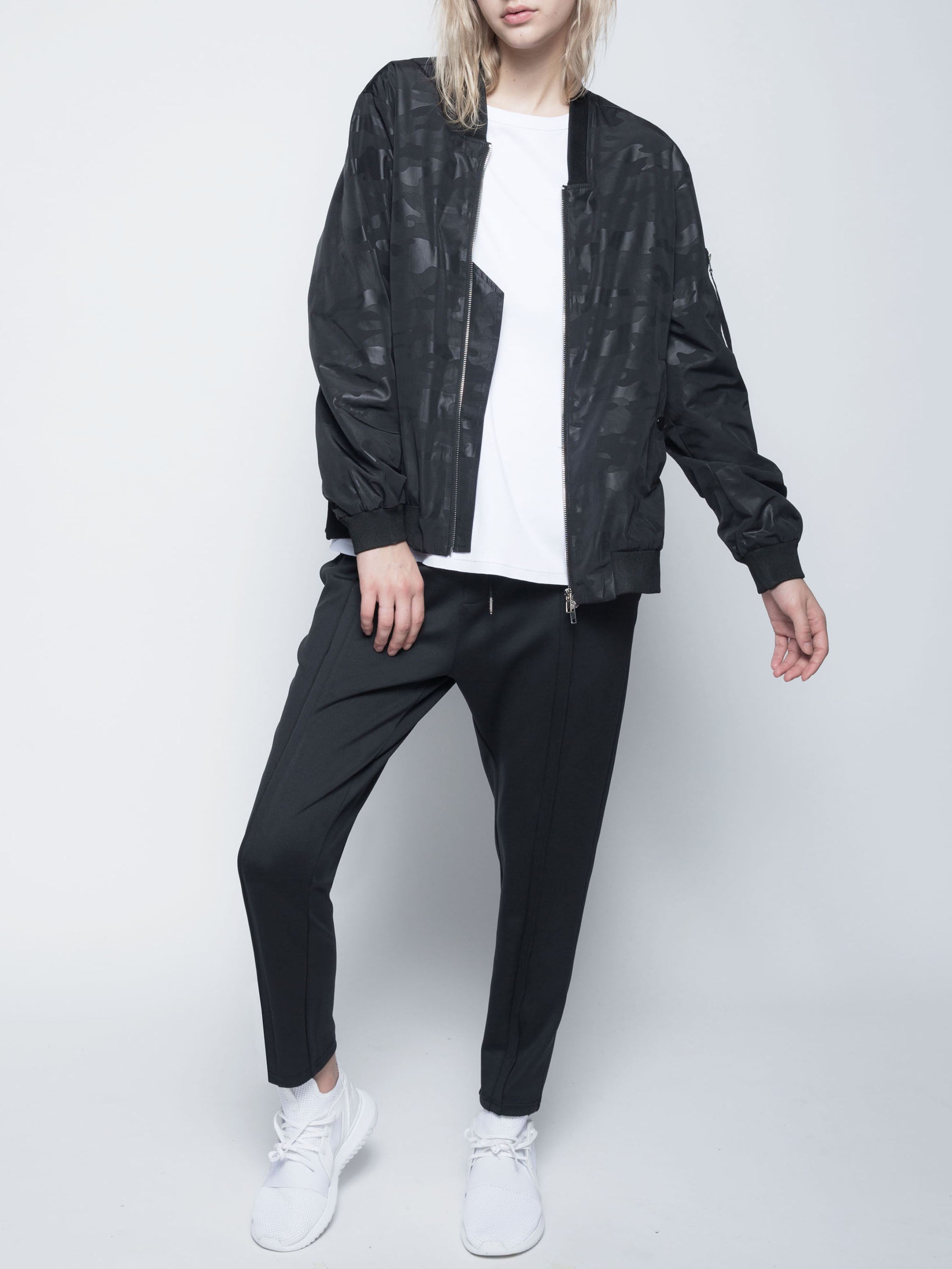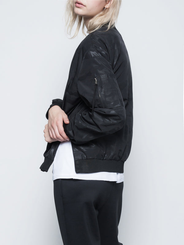 - Our aviator jacket is designed using water-repellent technical fabric featuring a geometric camouflage print with an embossed shine effect.