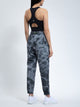 • Contrasted elastic bungee inside waistband exits at the center front grommets.